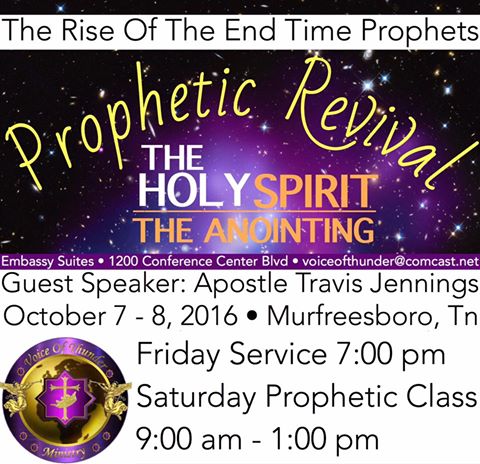 The Rise of the End Time Prophets Fri, October 7, 2016, 8:00 pm - Sat, October 8, 2016, 2:00 pm UTC-5 Embassey Suites 1200 Conference Center Blvd, Murfreesboro, United States $35