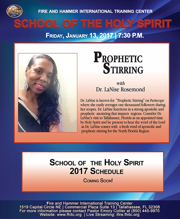 Prophetic Stirring with Dr. LaNise Rosemond Fri, January 13, 2017, 7:30 pm - 9:30 pm UTC-5 Fire and Hammer International Training Center 1519 Capital Circle NE, Commercial Plaza Suite 13, Tallahassee, Florida, United States Free